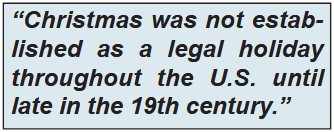 “Christmas was not established as a legal holiday throughout the U.S. until late in the 19th century. In 1659 the Puritan colony in Massachusetts passed a law that anyone ‘found observing any such day as Christmas or the like either by forbearing labor, feasting, or in any other way, shall be fined five shillings.’ Many early Americans who refused to work on Christmas either went to jail or paid fines.”1
