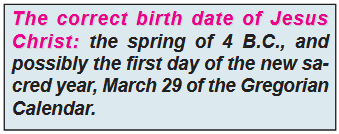 All reputable historians place the death of Herod in the spring of 4 B.C. As we shall see, Jesus Christ was born shortly before this date, since Herod, after quizzing the magi, had all the children slaughtered in Bethlehem who were two years old or less (Matthew 2:16), which also was the time near an eclipse of the moon. This eclipse can irrefutably be dated to having occurred on March 13, 4 B.C.21 Flavius Josephus in The Antiquities of the Jews clearly mentioned this fact, while giving a thorough outline of the events surrounding Herod’s life, rulership, and death.22 Josephus mentioned that Herod died just before the Passover, and described in detail the events of his life between the lunar eclipse and his death. The only question that arises concerning these events, to ascertain the date for Christ’s birth, is whether these events occurred in one month or in 13 months. These events are covered by Josephus in The Antiquities of the Jews, Book 17, Sections 6 to 9, which sections are included in Appendix I.