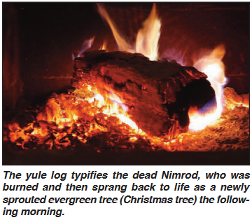 “It was no mere astronomic festival, then, that the Pagans celebrated at the winter solstice. That festival at Rome was called the feast of Saturn, and the mode in which it was celebrated there showed whence it had been derived. The feast, as regulated by Caligula, lasted five days; loose reins were given to drunkenness and revelry, slaves had a temporary emancipation, and used all manner of freedoms with their masters. This was precisely the way in which, according to Berosus, the drunken festival of the month Thebeth, answering to our December, in other words, the festival of Bacchus, was celebrated in Babylon. ‘It was the custom,’ says he, ‘during the five days it lasted, for masters to be in subjection to their servants, and one of them ruled the house, clothed in a purple garment like a king.’ This purple-robed servant was called Zoganes, the Man of sport and wantonness, and answered exactly to the Lord of Misrule, that in the dark ages was chosen in all Popish countries to head the revels of Christmas. The wassailing bowl of Christmas had its precise counterpart in the Drunken festival of Babylon; and many of the other observations still kept up among ourselves at Christmas came from the very same quarter. The candles, in some parts of England, lighted on Christmas-eve, and used so long as the festive season lasts, were equally lighted by the Pagans on the eve of the festival of the Babylonian god, to do honor to him: for it was one of the distinguishing peculiarities of his worship to have lighted was-candles on his altars. The Christmas tree, now so common among us, was equally common in Pagan Rome and Pagan Egypt. In Egypt that tree was the palm-tree; in Rome it was the fir; the palm-tree denoting the Pagan Messiah, as Baal-Tamar, the fir referring to him as Baal-Berith. The mother of Adonis, the Sun-God and great mediatorial divinity, was mystically said to have been changed into a tree, and when in that state to have brought forth her divine son. If the mother was a tree, the son must have been recognized as the Man the branch. And this entirely accounts for the putting of the Yule Log into the fire on Christmas-eve, and the appearance of the Christmas-tree the next morning. As Zero-Ashta, ‘The seed of the woman,’ which name also signified Ignigena, or born of the fire, ‘he has to enter the fire on Mother-night, that he may be born the next day out of it, as the Branch of God, or the Tree that brings all divine gifts to men.’ But why, it may be asked, does he enter the fire under the symbol of a Log? To understand this, it must be remembered that the divine child born at the winter solstice was born as a new incarnation of the great god (after that god had been cut in pieces), on purpose to revenge his death upon his murderers.”62