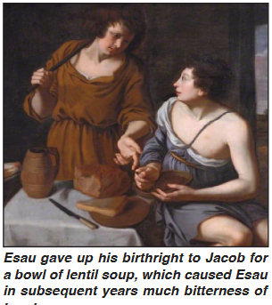 “Pursue peace with all people, and holiness, without which no one will see the Lord: looking carefully lest anyone fall short of the grace of God; lest any root of bitterness springing up cause trouble, and by this many become defiled; lest there be any fornicator or profane person like Esau,who for one morsel of food sold his birthright. For you know that afterward, when He wanted to inherit the blessing, he was rejected, for he found no place for repentance, though he sought it diligently with tears” (Hebrews 12;14-17).