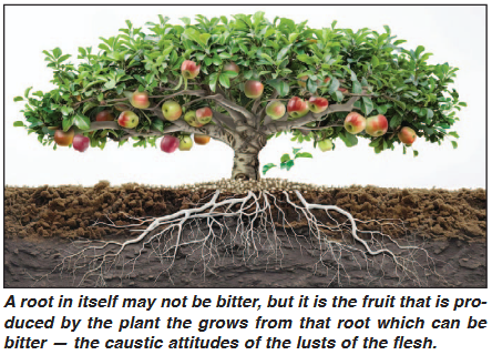 While roots are emphasized here as being associated with bitterness, it is really what grows from the roots that is implied. The metaphorical relationship of a plant to an attitude shows that a root, which germinates from a seed, supports a shoot that reaches upward from the soil and then feeds the root with the energy it receives from sunlight and carbon dioxide. The roots then grow and permeate the soil of one’s life, further enabling a growing plant to produce bitter, acrid, caustic, unsavory fruit — the fruit we identify as lusts of the flesh. These include a long list of traits: adultery, fornication, lewdness, hatred, contentions, jealousies, envy, selfish ambitions, and others (Galatians 5:19-21).