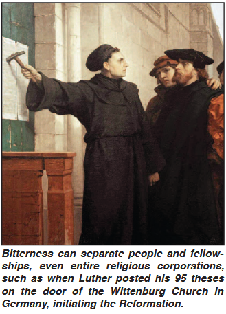 Separation of brethren. It is all-too-common for a bitter person within a fellowship to cause division. I have seen this happen up-close. A person feels mistreated or belittled by a brother or sister in Christ, and rather than go to that person in a spirit of love and forgiveness, the embittered person slyly sows supposed injustices experienced by this person in the minds of others, winning over the allegiance of others in the fellowship and arming them with information — oftentimes lies — that implicate the accused party of great evils. These “snared” brethren align themselves with the bitter person and avoid the accused brother or sister, dividing the congregation. The mutual love the brethren should have, which identifies them as God’s people (John 13:35), is suppressed by such narcissistic maneuvering, and the joy of brethren dwelling together in unity is compromised (Psalm 133).